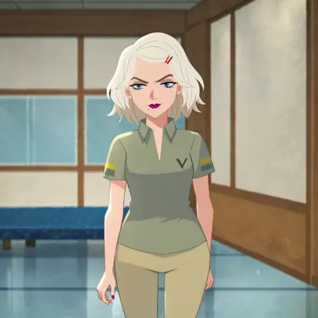 監獄服トリガー:TigressPrisonGear, 1girl, 緑のシャツ, パンツ, 白髪, 化粧, 髪飾り, 髪止め, リップスティック, 短い髪, 短い袖, 紫の唇, ポロシャツ, 胸, カウボーイショット