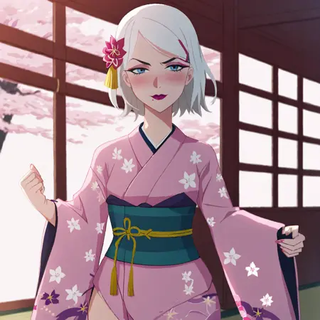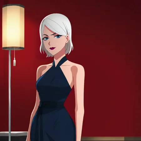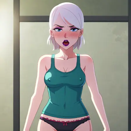 マスクなしトリガー:TigressNoMask, 青い目, リップスティック, 化粧, ボディスーツ, 短い髪, 1girl, 紫の唇, 白髪, カウボーイショット
