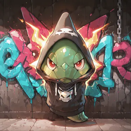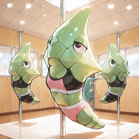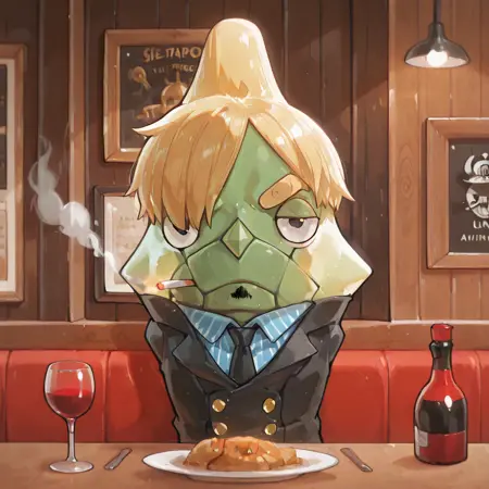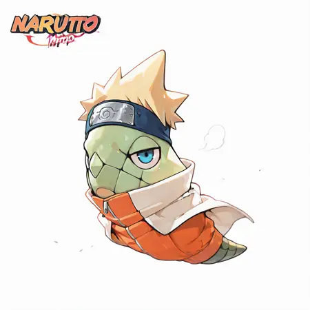 プロンプト: metapod, full body, slightly turned, two eyes visible, no hands, no arms, clothed pokemon, blonde hair, sweater, looking at viewer, anime, artwork lora:metapodXL\_clothed:1