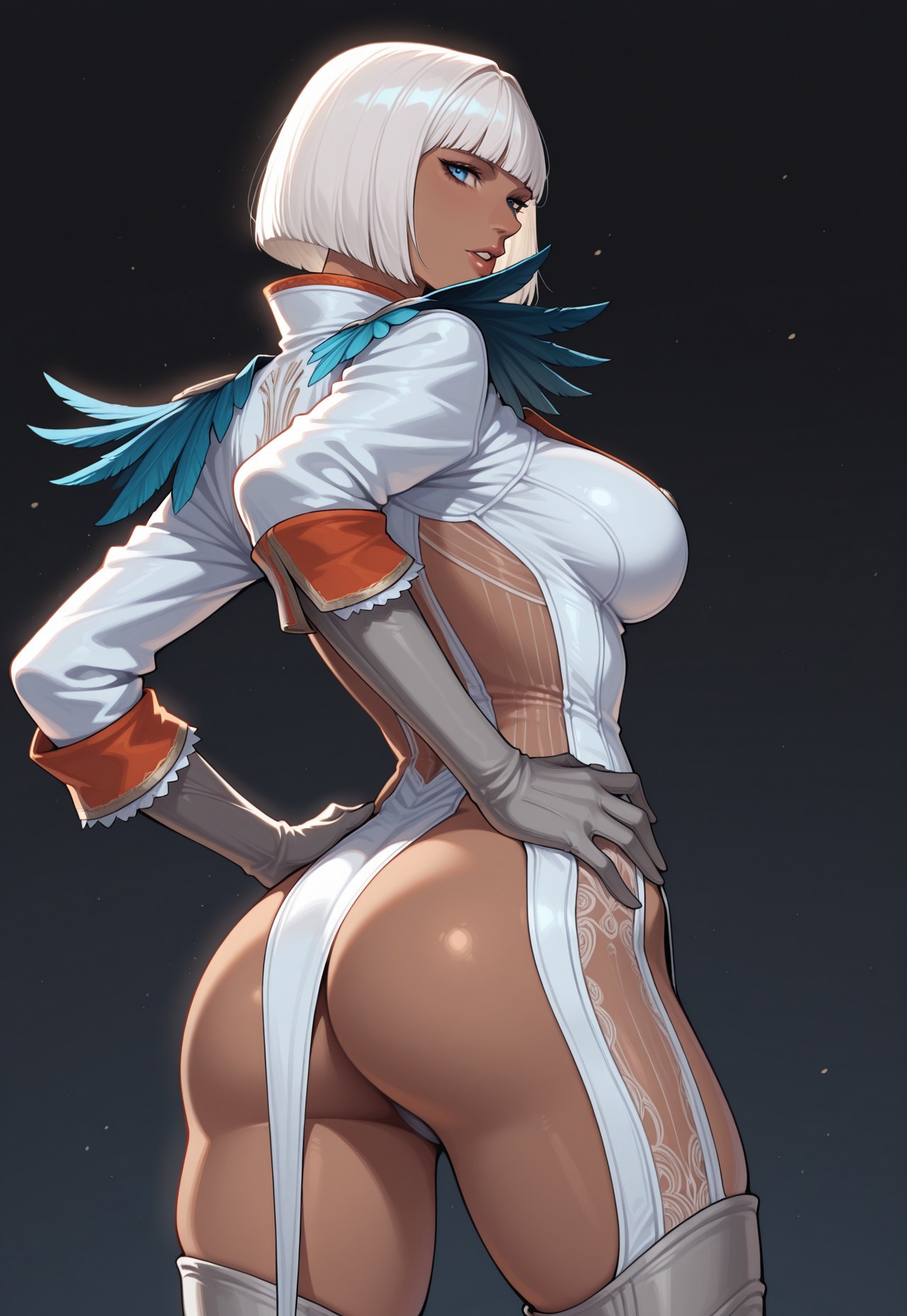 衣装 - 白いボディスーツ、中心部オープン、オレンジのレース、骨盤カーテン、羽のパウルドロン、肘手袋、太ももハイ、チョーカー