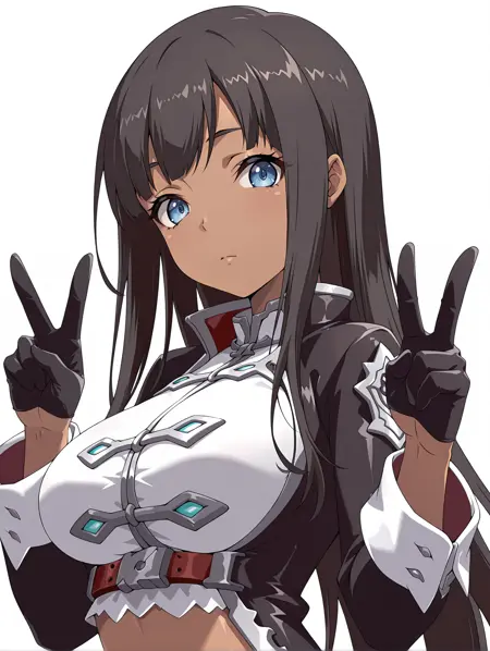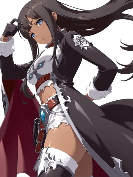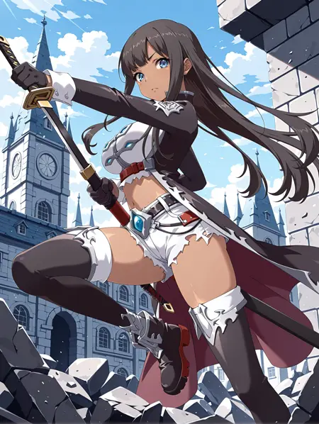 衣装ワード ・t_clothes,coat,midriff,gloves,short shorts,black_thighhighs,boots,t_sword,expressionless,