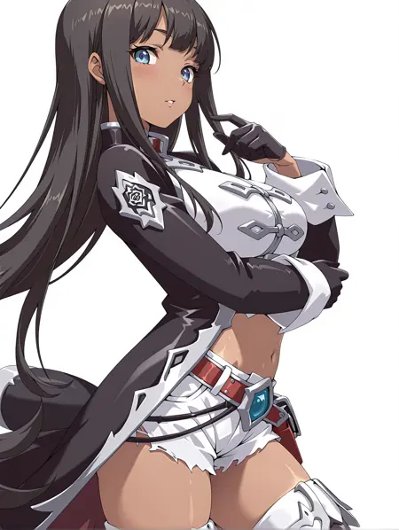 복장 단어: t_clothes, coat, midriff, gloves, short shorts, black_thighhighs, boots, t_sword, expressionless