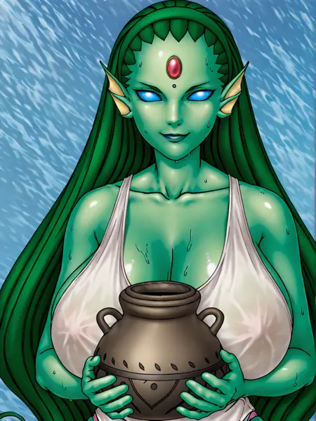 fairy_of_the_fountain,绿色皮肤,有色皮肤,额头宝石,蓝色眼白,绿发,长发,(无瞳孔),绿色发带,头部鳍片,怪物女孩,尖耳,化妆,(水壶,手持水壶),