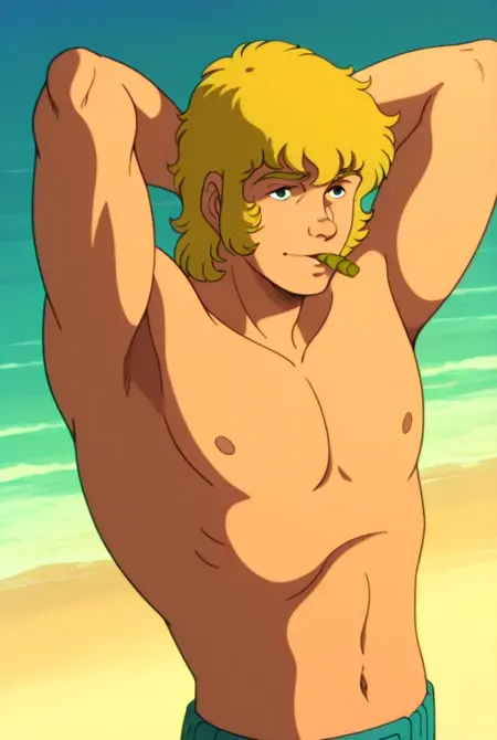 masterpiece, very aesthetic, 8k, best quality, CobraADStyle, Upper body, cobraman, 1boy, male focus, solo, blonde hair, topless male, 1980s (style), retro artstyle, arms behind head, at the beach standing, cigar at mouth