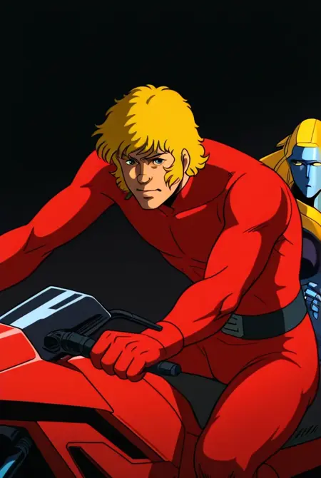 masterpiece, very aesthetic, 8k, best quality, CobraADStyle, Upper body, cobraman, blonde hair, 1boy, retro artstyle, grey eyes, high detail, depth of field, riding a science fiction motorcycle, android robot woman running at the back