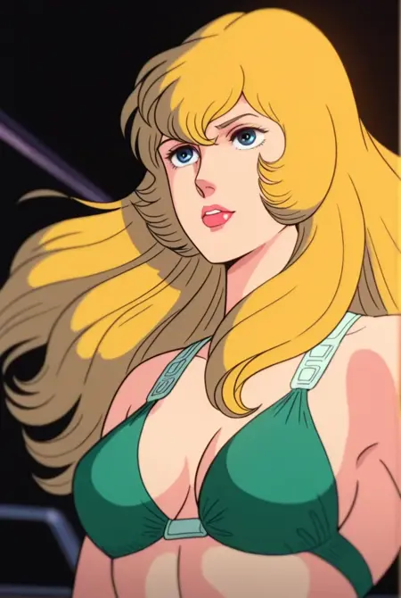 masterpiece, very aesthetic, 8k, best quality, CobraADStyle, Upper body, green bikini, dominqueroy, blue eyes, 1girl, blue eyes, solo, blonde hair, 1980s (style), long hair, retro artstyle, lipstick, lips, makeup, high detail, depth of field, posing at spacecraft, spotlight