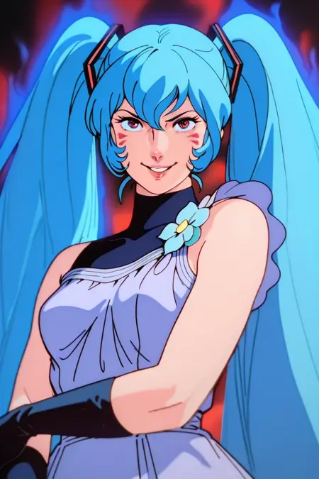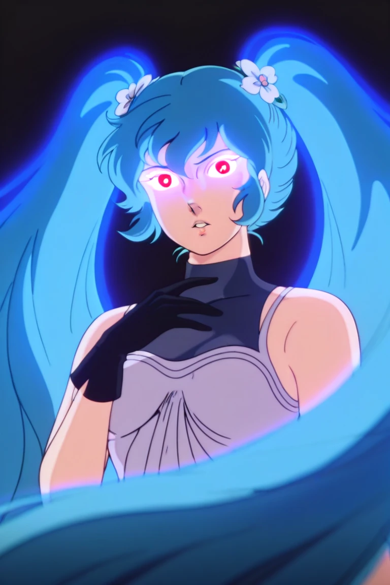 masterpiece, very aesthetic, 8k, best quality, CobraADStyle, sakurauru, sakuhair, 1girl, solo, girl, solo, long hair, hatsune miku, twintails, very long hair, dress, blue hair, gloves, upper body, closeup, looking at viewer, hair ornament, sleeveless, black gloves, multicolored hair, facial mark, flower, parted lips, absurdly long hair, aura, blue glowing eyes, impressionism, high detail, depth of field, looking at viewer, high detail, depth of field, posing