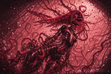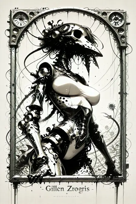 The name of the LoRA plays off of the names of the art books of Megrim Haruyo (i.e. Predatory Duality, Black Dahlia Immortal, Scar Queendom, etc.) That said, while Godless Prosthesis has the capability to twist and deform to various extents, I can't say that it's meant to emulate Haruyo's style. Megrim Haruyo's work is a collage of meat, metal, alien logic and anguish made to only hint at what was once human. Godless Prosthesis is more than willing to give a wink and smile with your now and forever irrefutable form.