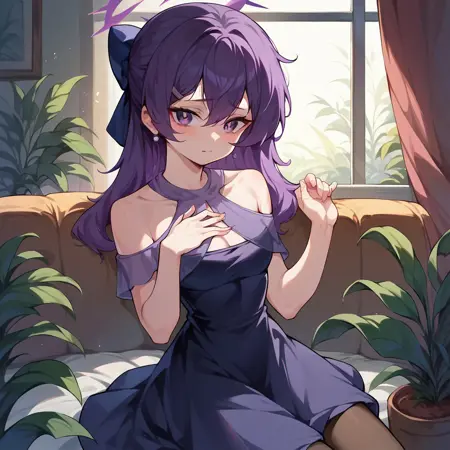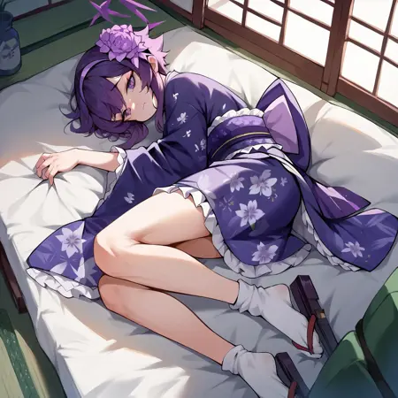purple flower, purple hairband, purple kimono, obi, white socks, sandals,