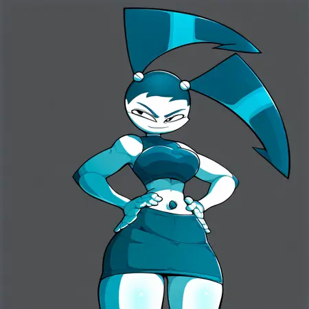 1girl, jenny, twintails, robot, blue hair, blue tube top, blue skirt, colored body, white skin,