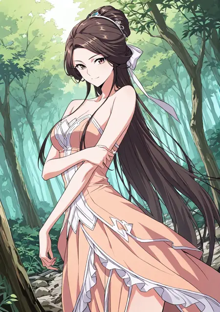 light orange dress, asymmetrical dress, sleeveless, strapless, high slit, white trim, layered skirt, open front skirt, fitted bodice, bare shoulders,