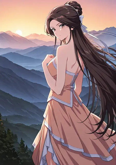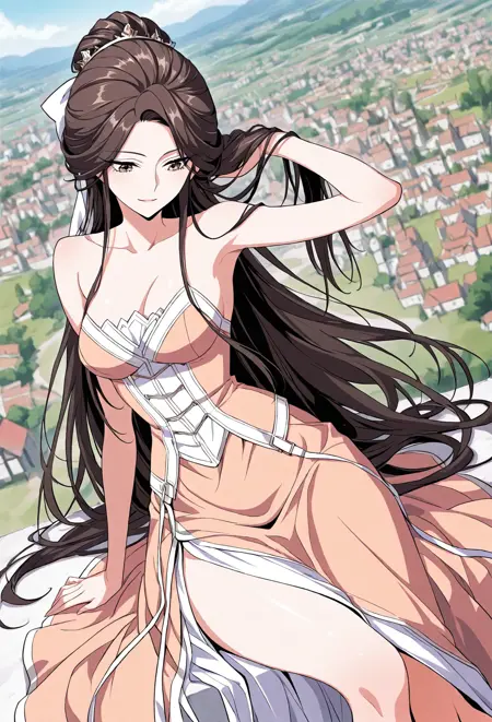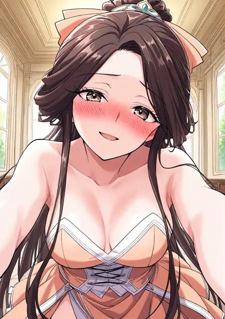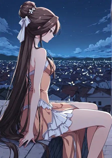 1 girl, solo, brown eyes, very long hair, dark brown hair, braided bun, long side strands, hair bow, long eyelashes,