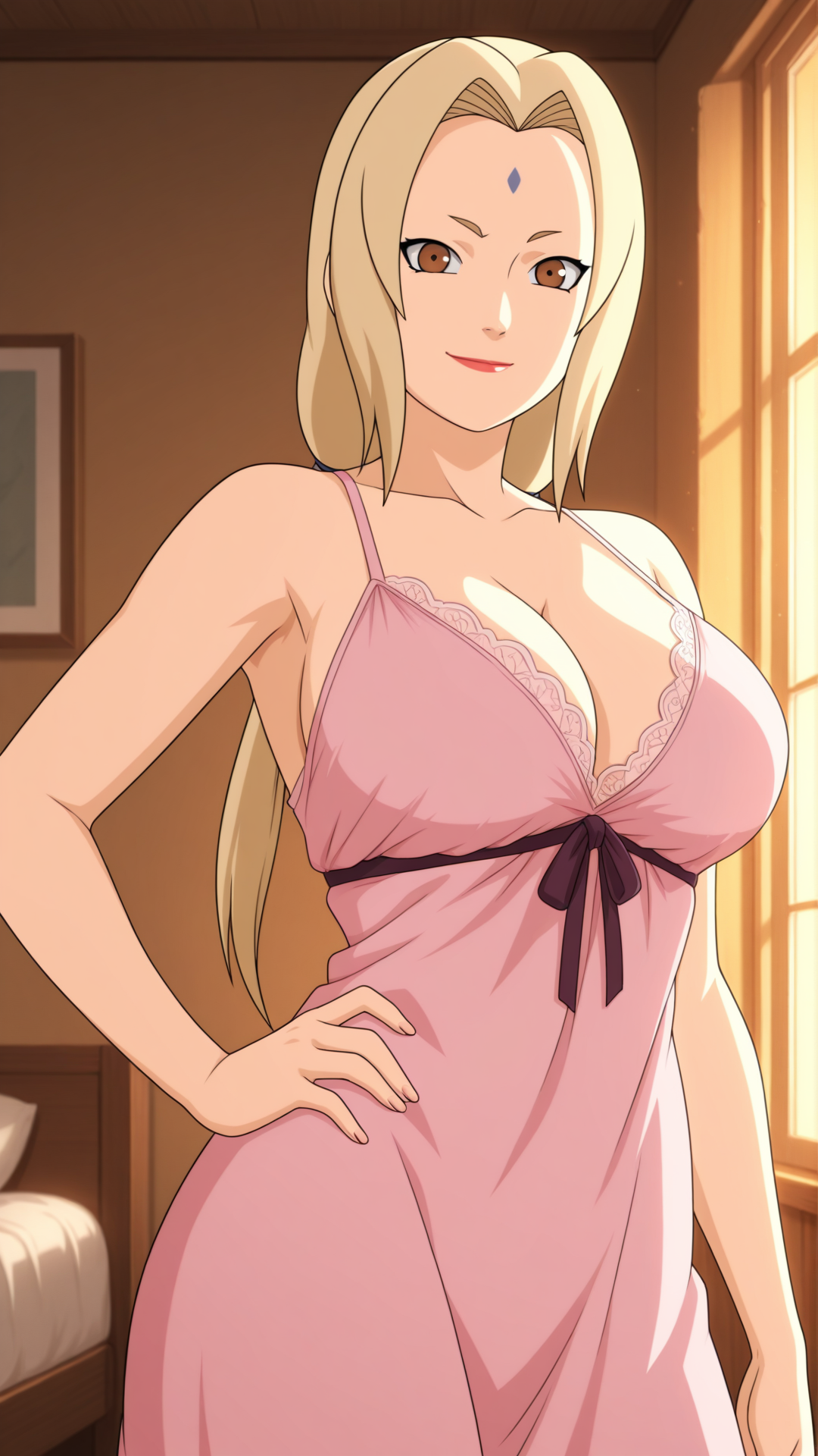 Tsunade_XL, facial mark, mature female, short eyebrows, forehead mark,