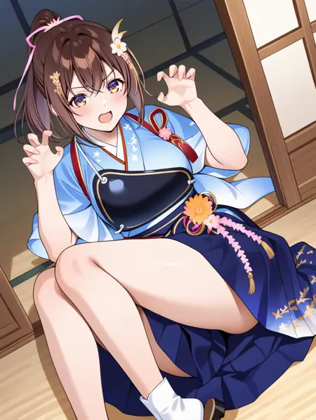 プロンプトの例: houkyuu,brown hair,ponytail,hair ornament,blue japanese clothes,blue print hakama,wide sleeves,muneate,flower,wide sleeves,solo,zouri,tabi,