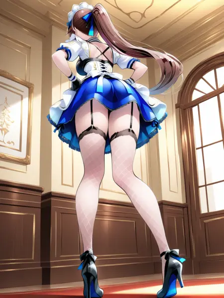 プロンプト例: meido,brown hair,ponytail,maid headdress,ribbon,maid,lace trim,garter straps,white fishnet thighhighs,puffy short sleeves,black gloves,high heels,indoors,blue skirt,solo,white corset,white sleeves,