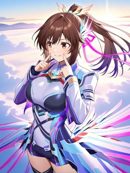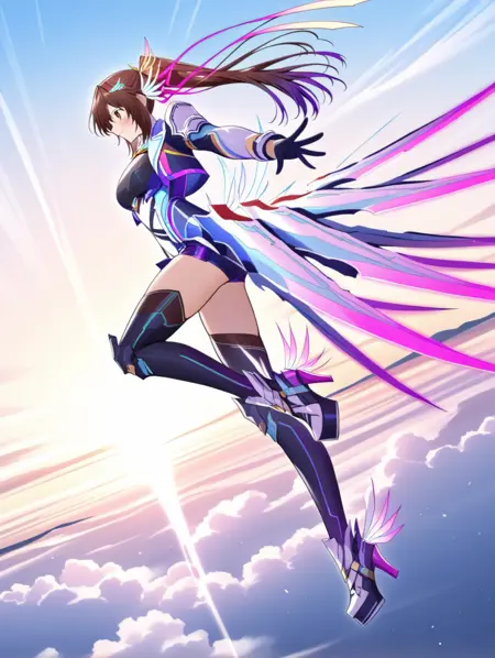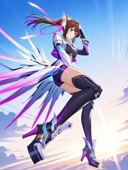 提示示例:sinnkyuu,brown eyes,brown hair,ponytail,hair ornament,long sleeves,open coat,edge skirt,thighhighs,high heels,sky,flying,wind,purple edge,short shorts,