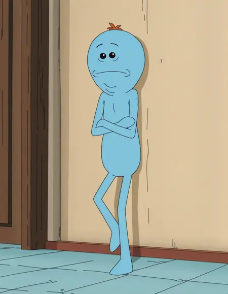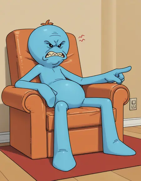rnm_mrmeeseeks, monster, 1other, solo, blue skin, black eyes, no nose, no fingers, no toes, bald, brown hair