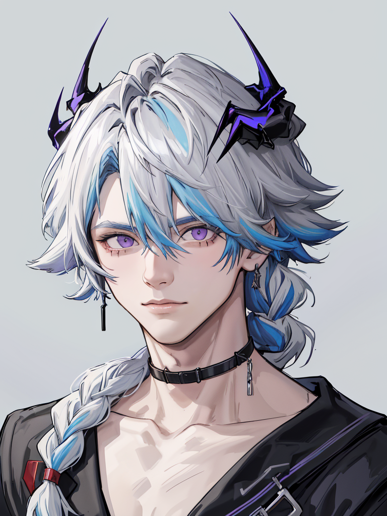 外貌:长发,灰发,蓝发,多色发,发丝遮眼,辫子,单辫,角,紫眼,尾巴