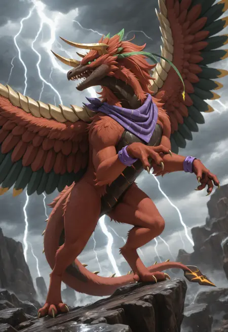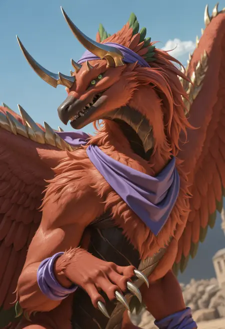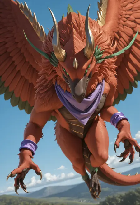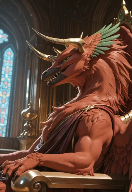 yharon_calamity_mod, dragon, feathered dragon, furred dragon, body fur, fluffy fur, solo, 1boy, male, no humans, wings, claws, tail, looking at viewer, sharp teeth, green eyes, colored sclera, single horn, forward horns, red body, crowned head