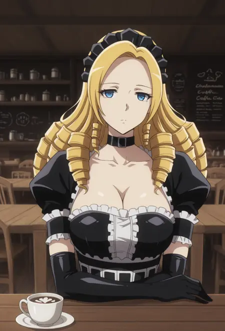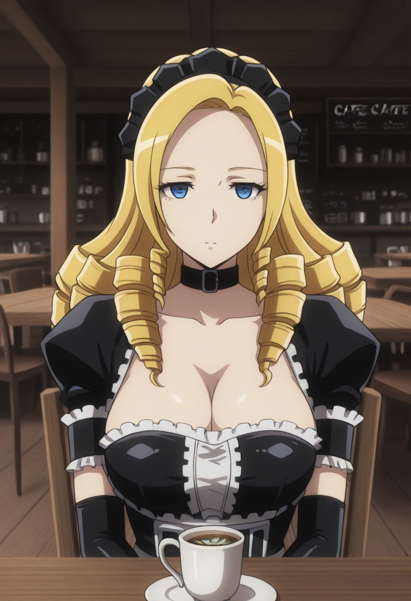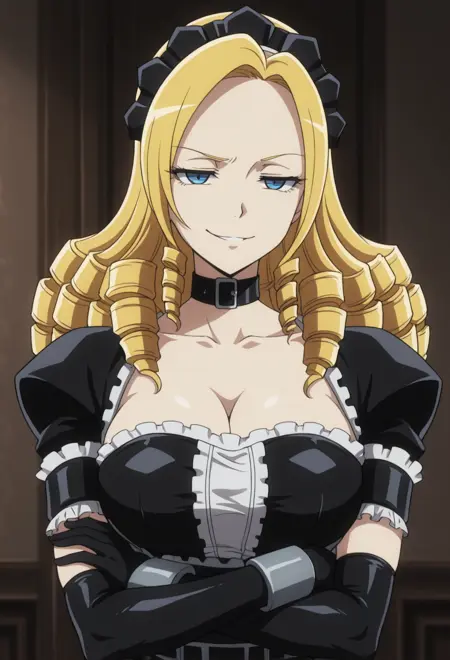 触发词 = zzsolutionzz,标签 = 金发,钻头发型,1个女孩,蓝眼睛,长发,单人,乳房,大乳房,女仆头饰,肘部手套,项圈
