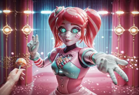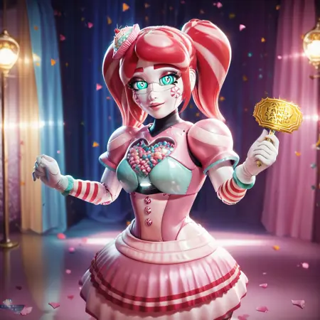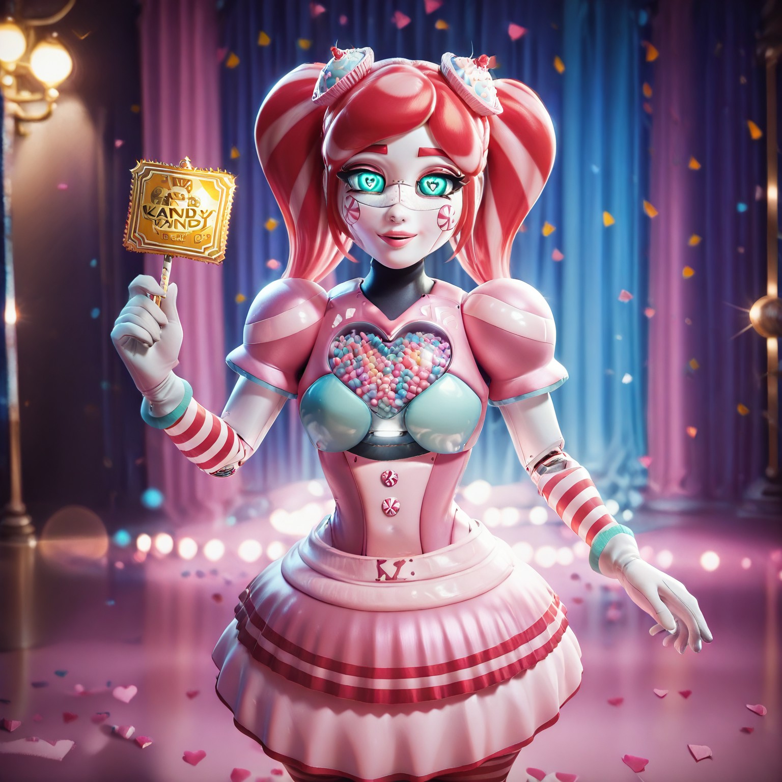 pink dress, heart shaped chest with candy inside, white gloves, red and white striped stockings, pink and teal high heels