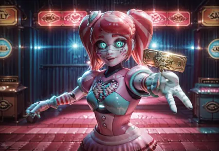 1girl, android, android joints, red and white striped hair, twin pigtails, neon teal eyes, realistic cgi, realistic,