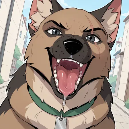 dog, german shepherd, black and brown fur, black eyes, scar across eyes, dog tail, black nose, green collar, silver dog tag,