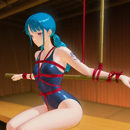 BambooElbowSpreader, shibari, bent elbows,red rope, brown bamboo stick, bound, squatting, rope bound bamboo stick,from behind, bamboo stick behind back