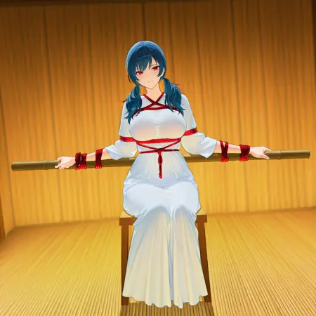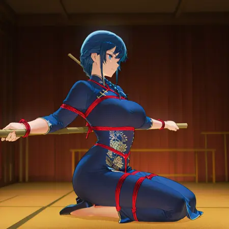 BambooElbowSpreader, shibari, bent elbows,red rope, brown bamboo stick, bound,sitting, rope bound bamboo stick,full body,