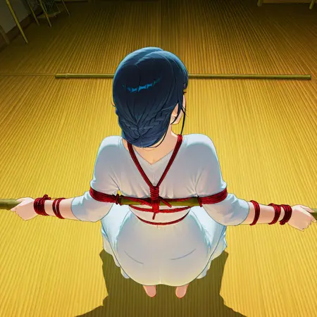 BambooElbowSpreader, shibari, bent elbows,red rope, brown bamboo stick, bound,squatting, rope bound bamboo stick,full body,from above,from behind