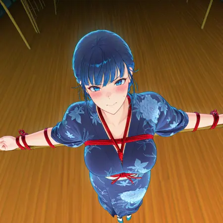 BambooElbowSpreader, shibari, bent elbows,red rope, brown bamboo stick, bound,standing, rope bound bamboo stick,full body,from above