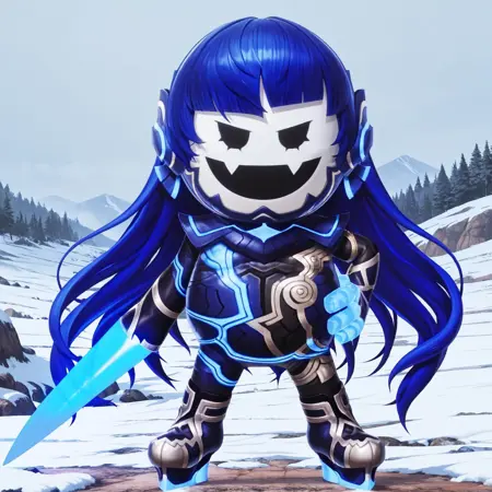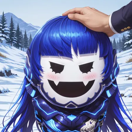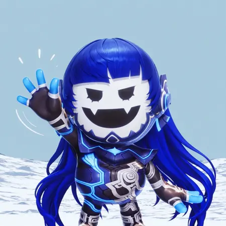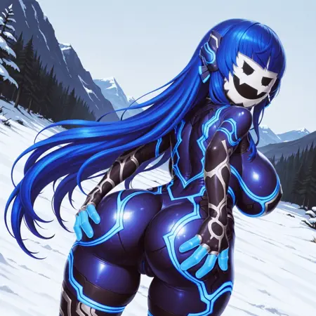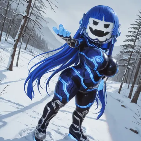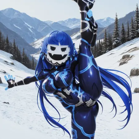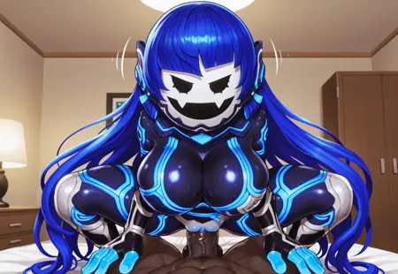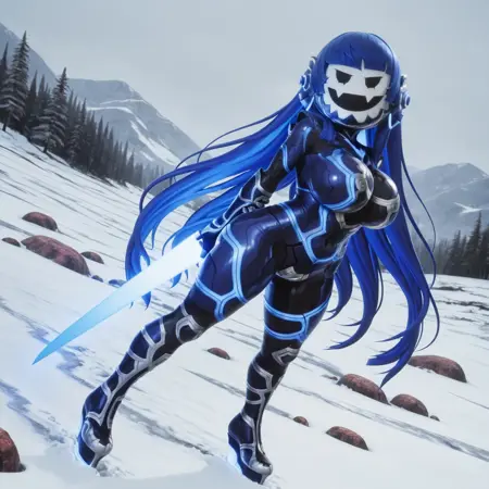 肯定的プロンプト:Nahobeeho、人間型、性別不明、青髪、非常に長い髪、姫カット、黒目、モブ顔、肉の牙、白色の体、白い肌、青色のボディスーツ、多色のボディスーツ、フルボディスーツ、腕の武器、薄い青色のプラズマソード、青い指