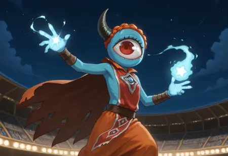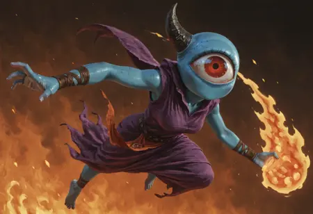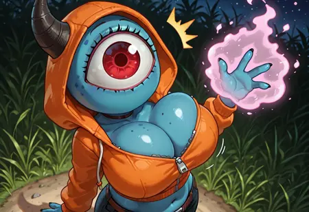标签:人造人、矮小、怪物女孩、蓝色皮肤、红眼、无嘴、独眼 [或单眼]、角(可选)、Q版(可选,有助于让她更小,有时她并不够小)
