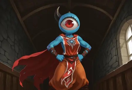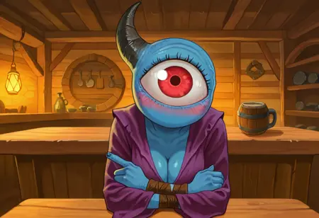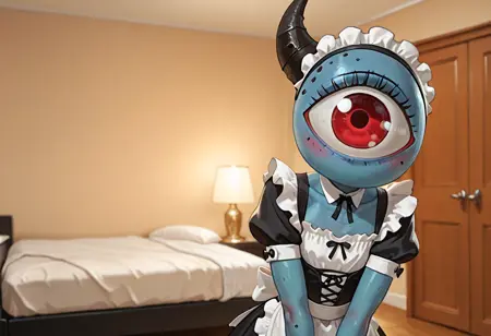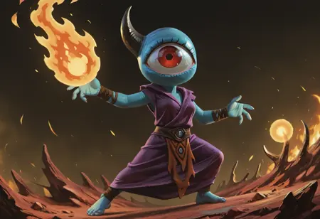 Tags: homunculus, short, monster girl, blue skin, red eye, mouthless, cyclops [or one-eyed], horn (optional), chibi (optional can help make her smaller as sometimes she aint)