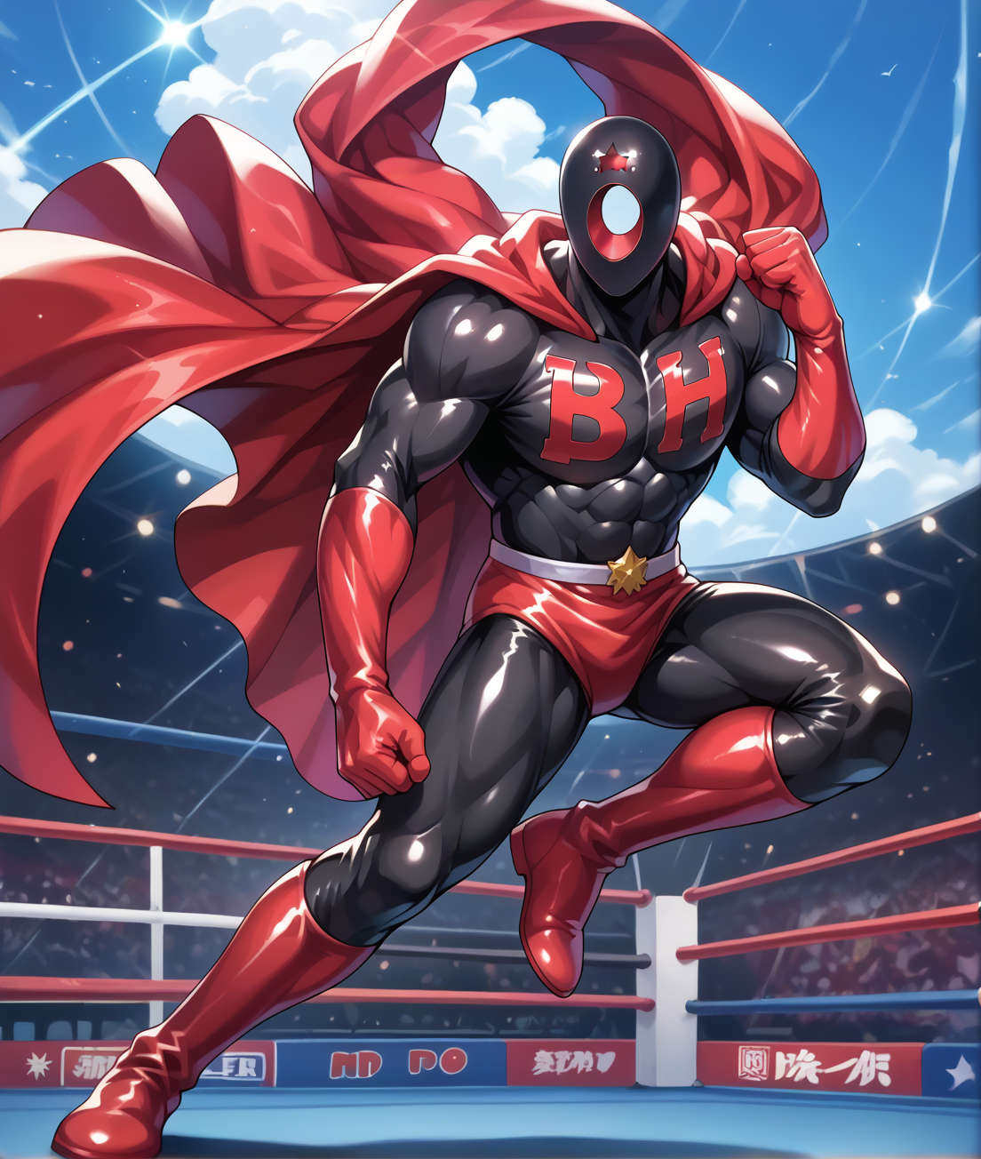 BlackHole, black bodysuit, face hole, faceless, wrestling, blue sky, earless, no humans, standing, solo, mouthless, no ears, large hole, superhero, gloves, boots, anime pose,night,
