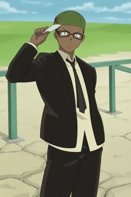 フォーマル、黒いジャケット、ベージュのシャツ、黒いネクタイ、黒いパンツ、緑のベースボールキャップ