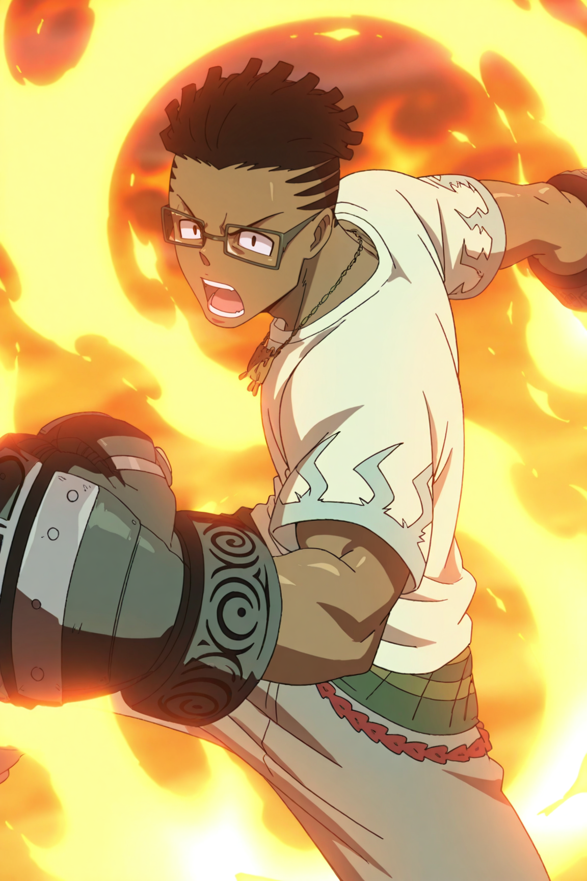 白いシャツ、ネックレス、灰色のパンツ、スニーカー