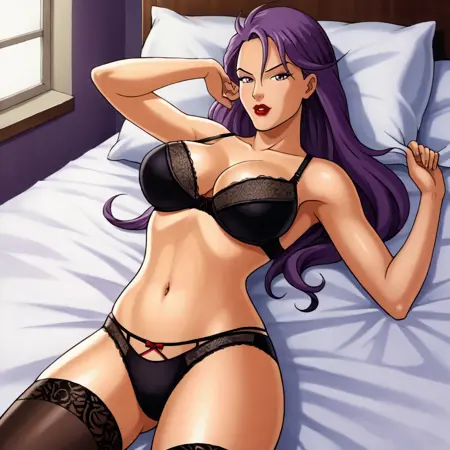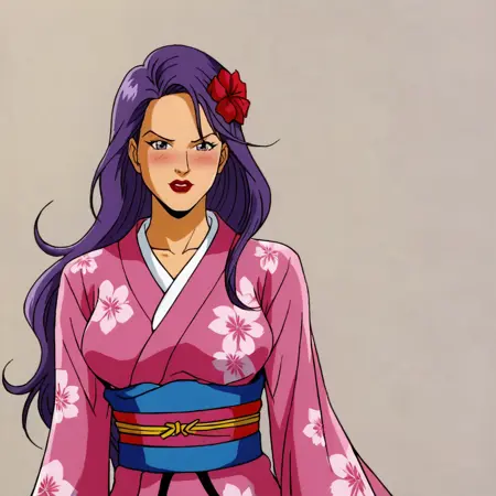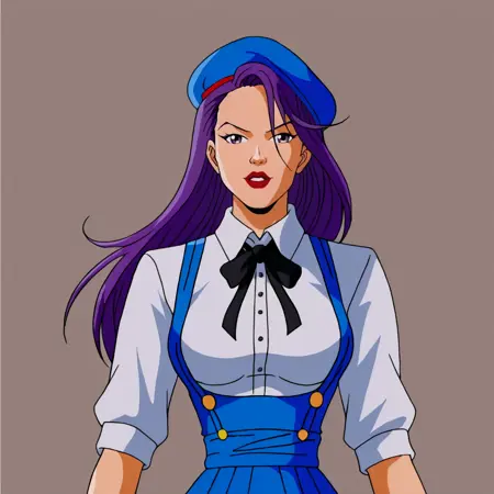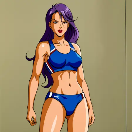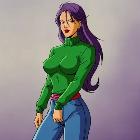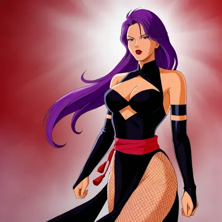 - トリガー:Psylocke, 1girl, 紫色の髪, 青色のレオタード, 長い髪, レトロなアートスタイル, 肘までの手袋, リップスティック, 胸, 化粧, 指なし手袋, サッシュ, 1990年代(スタイル), 肩出し, 婚礼用ガントレット, 赤い唇
