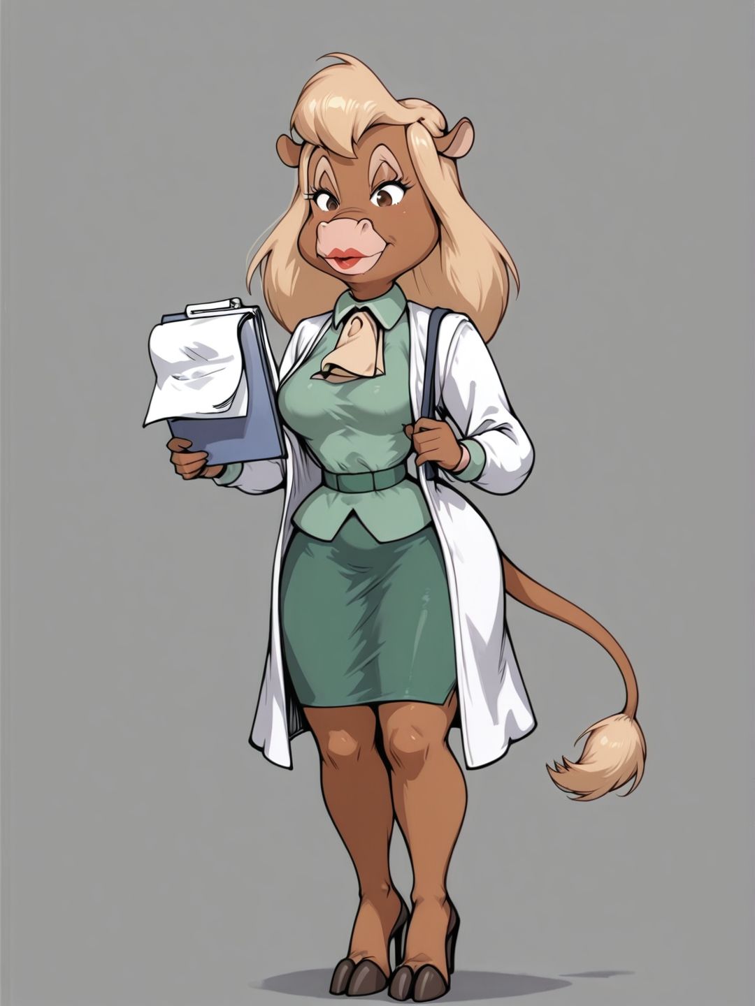 她是一头金发母牛,穿着整洁的绿色商务套装,面无表情,是团队中的“聪明人”。