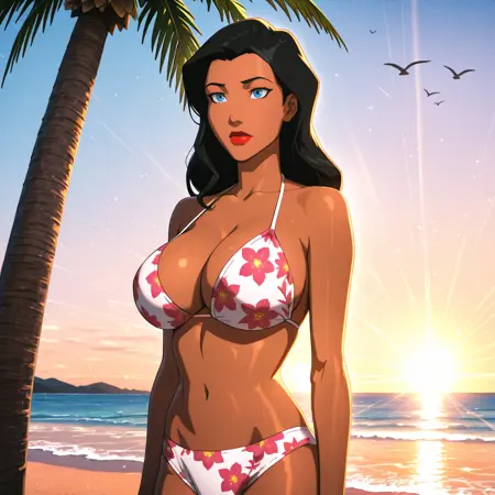 • Trigger : zatannaYoungJustice, 1girl, black hair, lipstick, blue eyes, makeup, medium breasts, white bowtie, dark skin, cleavage, red lips, dark-skinned female, pantyhose, bow, long hair, jacket, white gloves, leotard