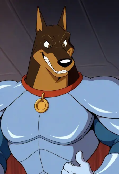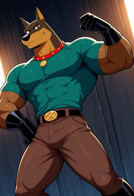 Reinforcement Prompt: "doberman, furry, muscular, bara, large pectorals, manly, mature, brown fur"