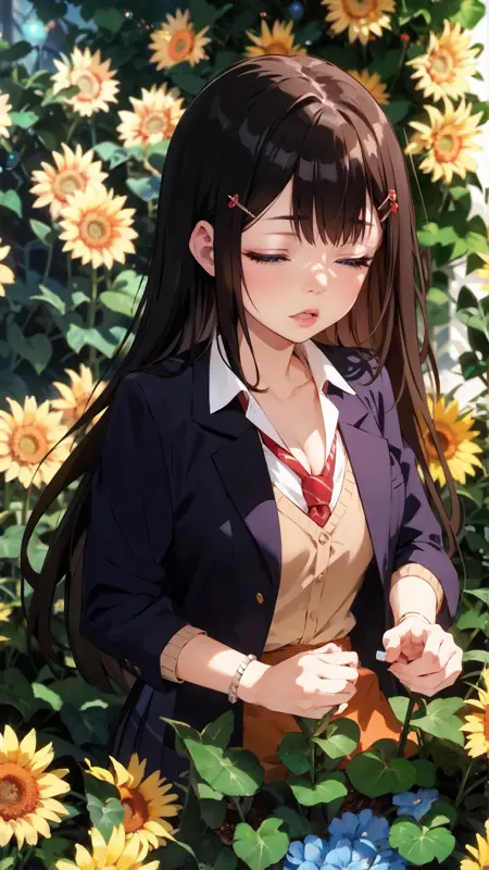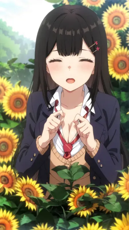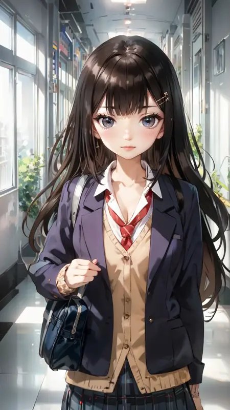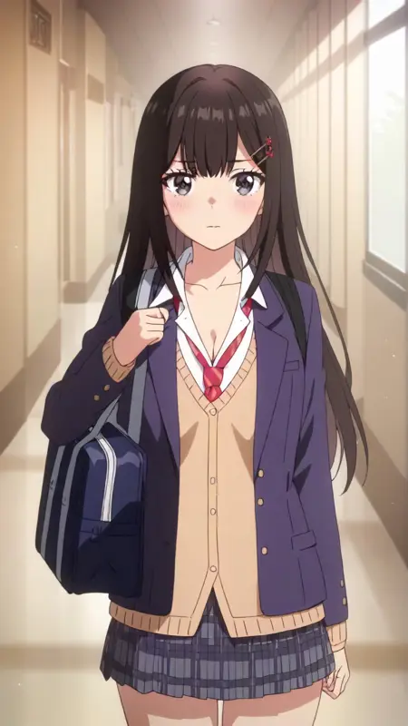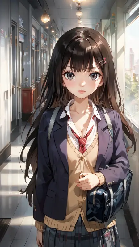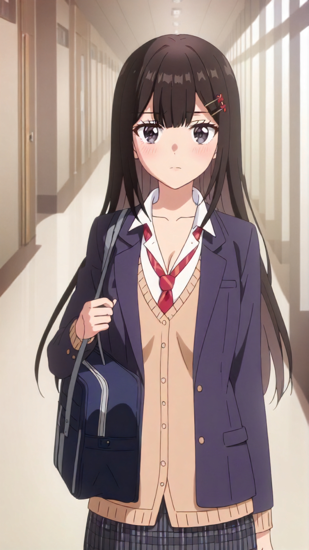 예시 프롬프트: "rion_enomoto, an anime girl, 1girl, solo, long hair, breasts, looking at viewer, blush, bangs, skirt, shirt, black hair, hair ornament, long sleeves, cleavage, closed mouth, school uniform, standing, collarbone, jacket, white shirt, pleated skirt, open clothes, necktie, hairclip, collared shirt, indoors, miniskirt, bag, black eyes, open jacket, plaid, window, plaid skirt, blazer, cardigan, red necktie, school bag, school, hallway"