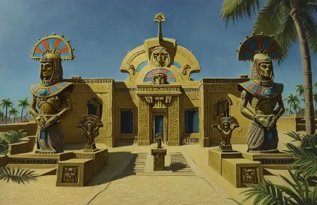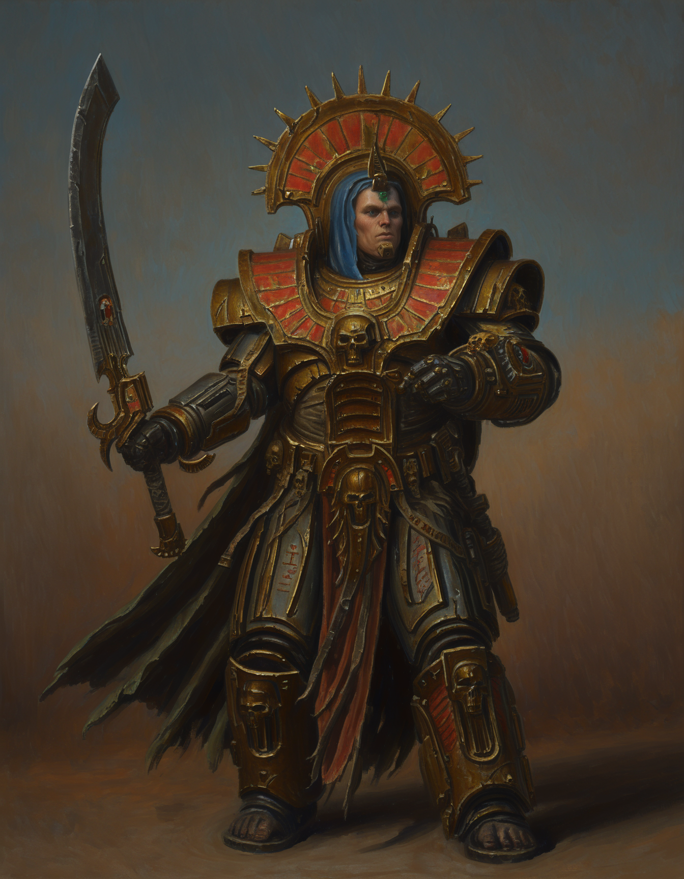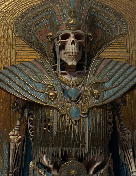 armor, skull, egyptian clothes, weapon, skeleton, holding weapon, helmet, undead, mask, mummy, statue, monster, glow, ornament,