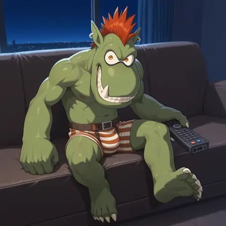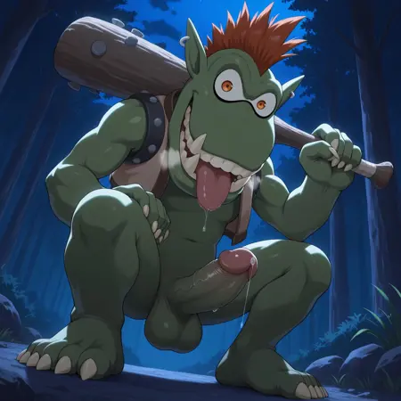 사용 태그: 인체형, 디지몬 (생물), 빨간 머리, 주황색 눈, 이빨, 모하awk, 녹색 피부, 날카로운 귀, 큰 송곳니, 발톱, 발가락 발톱, 한쪽 귀에 귀걸이,