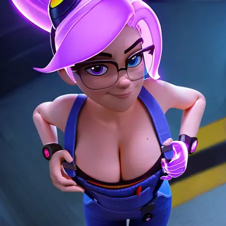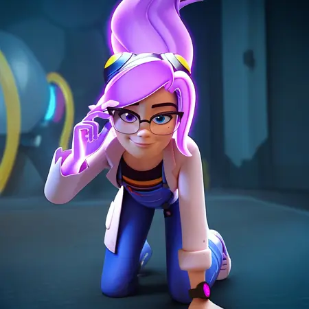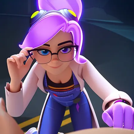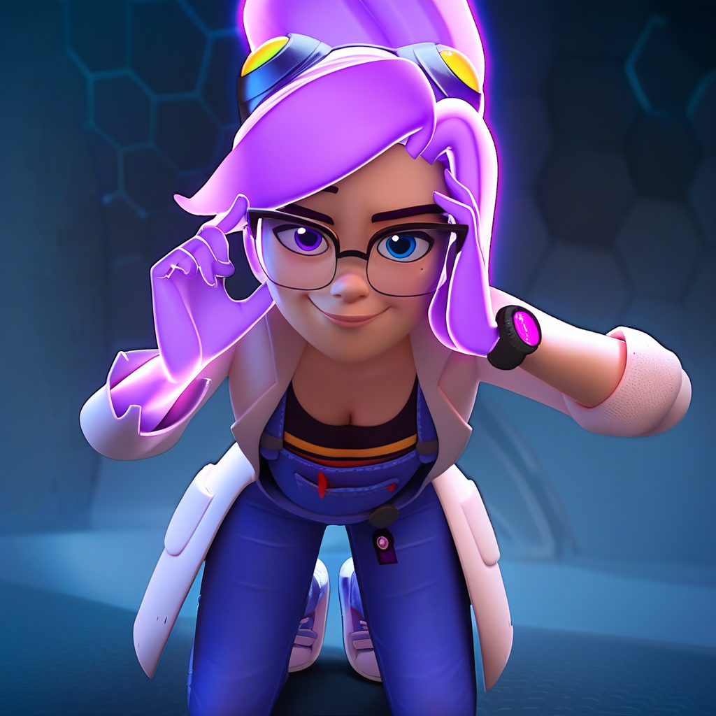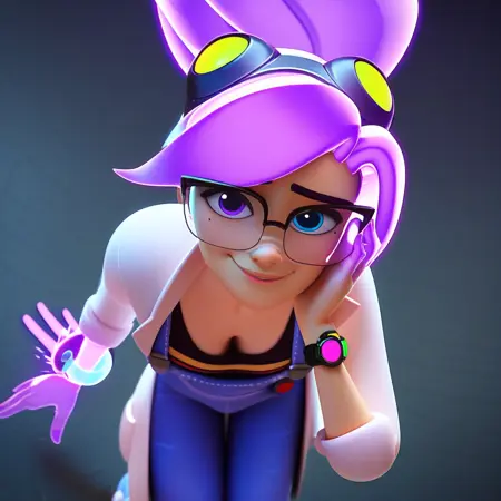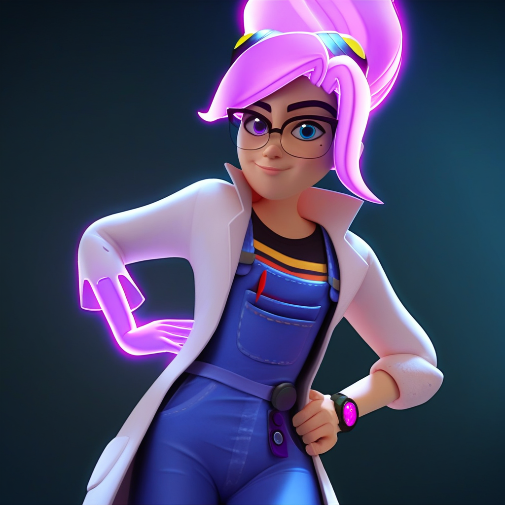 | 학습된 단어 | ponytail, transparent hair, purple hair, glowing hair, floating hair, glasses, goggles, glowing hand, purple hand, translucent hand, mole, heterochromia, blue eye, purple eye, black graphic tee, denim overalls, purple sneakers, lab coat, wristwatch, 복사됨! |