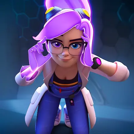 ponytail, transparent hair, purple hair, glowing hair, floating hair, glasses, goggles, glowing hand, purple hand, translucent hand, mole, heterochromia, blue eye, purple eye, black graphic tee, denim overalls, purple sneakers, lab coat, wristwatch,