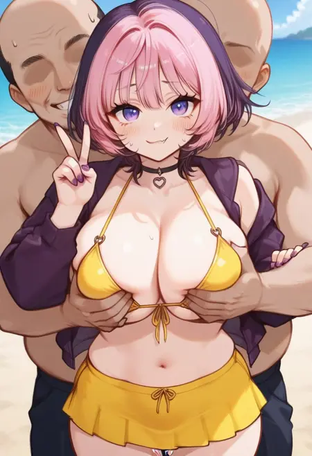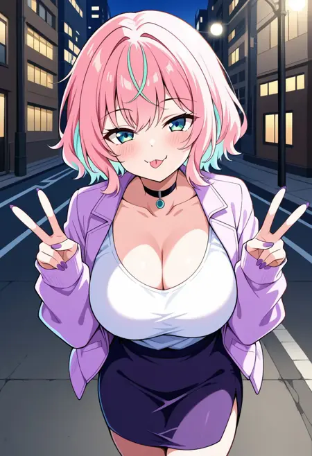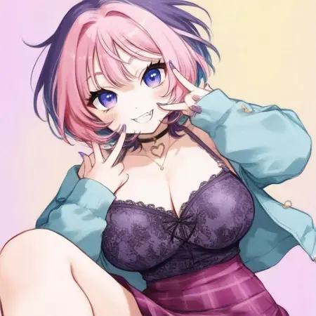 jacket,skirt, purple nails, nail polish, thighhighs, cleavage, jewelry, pink hair, multicolored hair, choker, necklace,