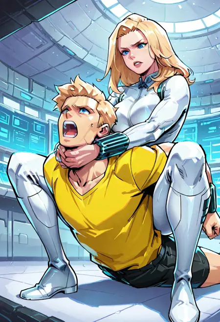 masterpiece, very aesthetic,8k, best quality,camelclutch, ((fronthold)), ((on stomach)), squatting, strangling, 1girl, 1boy, blonde hair, barefoot, gloves, From Blew, (( Closeuphold )) impressionism, high detail, depth of field,