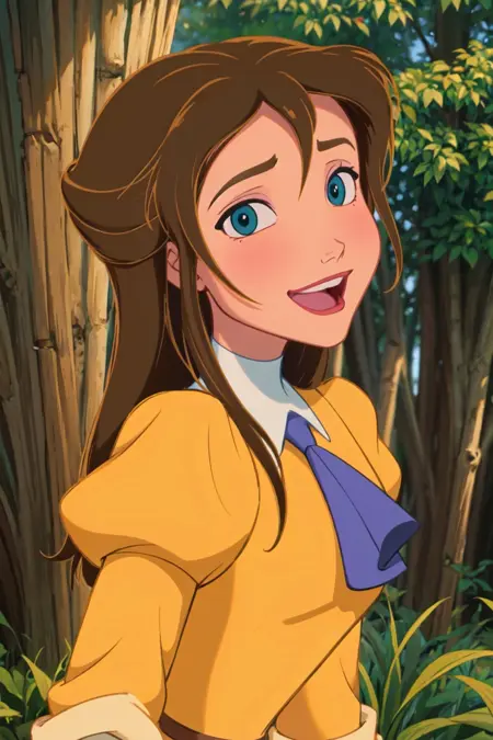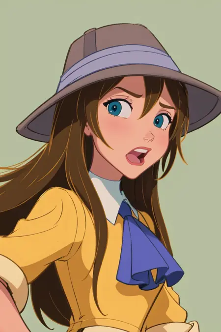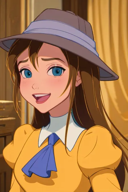 要还原她的原始服装,请使用以下标签:pikkyjane, 1girl, solo, looking at viewer, brown hair, long hair, blue eyes, breasts, medium breasts, gloves, dress, makeup, yellow dress, white gloves, lipstick