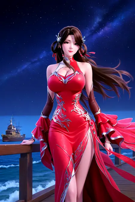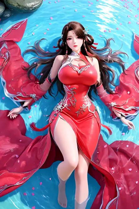 huo linger, hair ornament, brown hair, long hair, forehead mark, facial mark, hair rings, hair circle, double hair circle, hair bun, red dress, clothing cutout, cleavage cutout